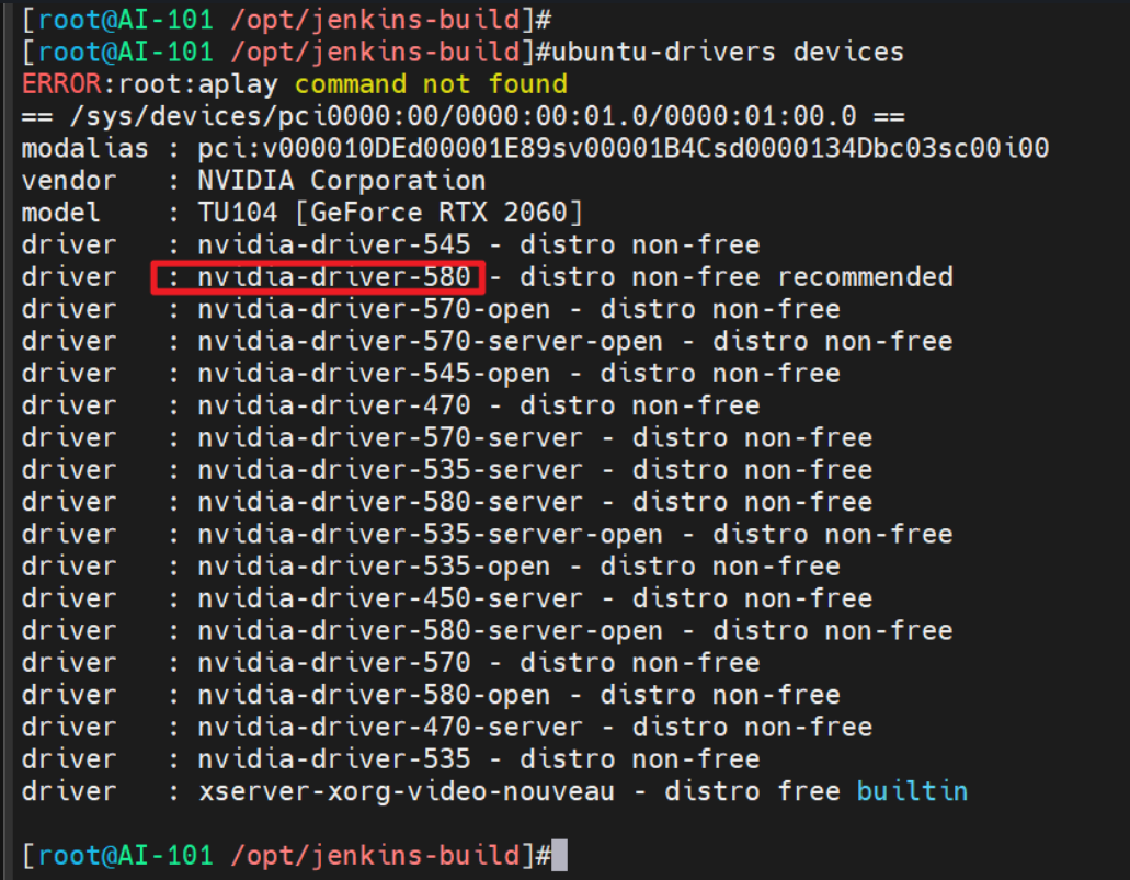 注意recommended字段,那么应安装驱动 nvidia:580