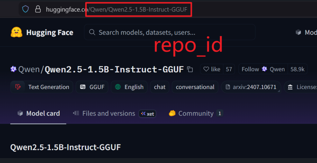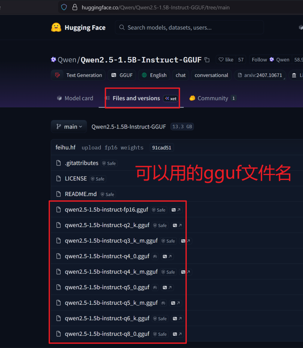 qwen 2.5 1.5B模型的huggingface仓库: https://huggingface.co/Qwen/Qwen2.5-1.5B-Instruct-GGUF