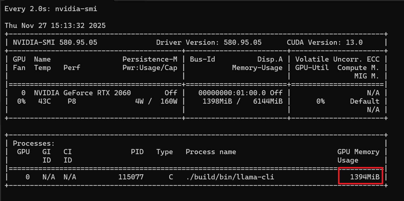 -ngl调小一点,避免显存爆掉-c 2048全称是--ctx-size,表示 上下文窗口长度(最大可记住多少 token),2048 就是大约 2K token 的窗口模型一次对话能“记住”的内容越多,对长对话/长文档更有利,但是会导致显存占用增加,尤其是推理的时候